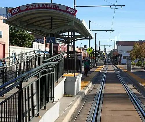 25th & Welton station (sometimes styled as 25th•Welton) is a RTD light rail station in Denver, Colorado, United States. Originally operating as part of the D Line, the station was opened on October 8, 1994, and is operated by the Regional Transportation District.[3][4] Located in the Five Points neighborhood, it is the stop closest to the Blair-Caldwell African American Research Library. The January 14, 2018, service changes introduced the L Line, which now serves this station in place of the D Line.[5]