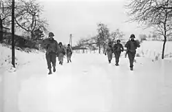When the Battle of the Bulge began the 2nd Infantry Regiment moved to the battle zone in the area of Nideranven, Luxembourg. In January 1945 the 2nd Infantry Regiment forced a crossing of the Sauer River and attacked into the Siegfried Line. The regiment then crossed the Rhine River near Oppenheim and secured the crossing for other Third Army units. The unit then spearheaded the attack into Czechoslovakia and was located near the town of Volary when the word came to cease all forward movement at 08:31 on 7 May 1945.