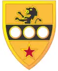 The 305th's coat of arms was approved on 29 October 1924, and its distinctive unit insignia was approved on 30 January 1925. Both were rescinded on 2 February 1959. The distinctive unit insignia included a 1 1/8 in (2.86 cm) gold colored metal and enamel device, which consisted of a yellow shield divided by a black stripe with three plates in the center. A lion rampant was depicted above the stripe, and a red star with yellow border below it. The shield's color symbolized the cavalry, the stripe and lion were taken from William Penn's coat of arms, and the red star symbolized the 305th's initial organization in Texas and its artillery service. The regimental coat of arms was of a similar design to the distinctive unit insignia but included the Organized Reserve's Minuteman crest above the shield.[6]
