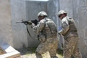 ![]() A trombone player with the 323rd Army Band engages several targets during a “stress shoot” marksmanship practice at Fort Bragg, 26 August 2014. | |