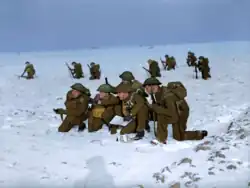 During the winter of 1942–43, the British Army overhauled its training of recruits. The 48th was one of three divisions that were changed from "Lower Establishment" units to "Reserve Divisions".[46] On 20 December, the division was renamed the 48th Infantry (Reserve) Division, becoming a training formation in the process. This reorganisation took place during 1943 and the division held this training role for the remainder of the war.[42][46][47] These three divisions were supplemented by a fourth training formation (the 80th Infantry (Reserve) Division), which was raised on 1 January 1943.[48] The 48th Infantry (Reserve) Division was assigned to Northern Command[47] Soldiers who had completed their corps training were sent to these training divisions.[49][c] The soldiers were given five weeks of additional training at the section, platoon and company level, before undertaking a final three-day exercise. Troops would then be ready to be sent overseas to join other formations.[49] Training was handled in this manner to relieve the "Higher Establishment" divisions from being milked for replacements for other units and to allow them to intensively train without having to cope with recruits.[47] During this period, from 17 October 1942 until 30 September 1943, the 10th Tank Brigade was assigned to the division for the holding and training of reinforcements to armoured units.[50] On 7 November 1943, the 145th Infantry Brigade was disbanded.[41]