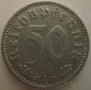 The 50 Reichspfennig coin was minted by Nazi Germany between 1939 and 1944 during World War II. It is worth 1⁄2 or .50 of a Reichsmark. Made entirely of aluminium, the 50 Reichspfennig is an emergency issue type, similar to the zinc1, 5, and 10 Reichspfennig coins from the same period.