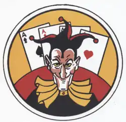 - ^ Approved 10 May 1943.Description: On a disc per fess debased arched, orange and red, within a border black, piped white, four playing cards (aces) arranged spades, diamonds, clubs, and hearts, reading from dexter to sinister, issuing from arched segment in base, all behind a knave with evil facial expression, wearing black suit, orange collar, black hat of three points, trimmed and balled in each point of red.