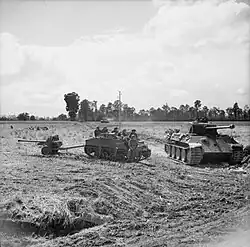 During Operation Martlet, the preparatory attack for Operation Epsom that took place on 25 June 1944, the brigade was heavily engaged around the village of Rauray with elements from the 12th SS Panzer and 26th SS Panzer Grenadier Regiments of the 12th SS Panzer Division.[8] The 70th Brigade then fought a bloody battle around Rauray as Kampfgruppe Weidinger of 2nd SS Panzer Division counterattacked between 29 June and 1 July.[9] For this it was given the battle honour of 'The Odon'[10]