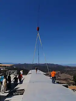 Hertz convinced the client to purchase the 747 airplane, originally worth about $25 million when Boeing completed it in 1970, for US$35,000. Mark Thompson of Thompson Aviation sold the airplane and his team detoxified, cut apart, and transported the plane for airlift. Using a laser and the cut-off saws at the Victorville Airport, home of the second largest airplane graveyard in the nation, the cockpit and tail were removed and the fuselage cut longitudinally. Next, transverse sectioning reduced large segments of fuselage and the wings to a manageable size for transport. A truck carried the parts, measuring 47 by 125 feet (14 by 38 m), successfully without damage. Seven California Highway Patrol vehicles escorted the truck during the night and closed multiple lanes of three major freeways, State Routes 2 and 15, and US Route 101, to accommodate the vehicle. The wings traveled from the Southern California Logistics Airport aircraft boneyard to Camarillo Airport in Camarillo, California, located 10 miles from the site. At that point, because each wing weighed approximately 20,000 lb (9,100 kg) and the only way to transport such heavy, unwieldy sections to a remote destination was from above (navigation by truck was deemed impossible), the wings needed to be cut in two for proper positioning for transport by helicopter, which was completed by a Columbia Model 234 operated by Columbia Helicopters Inc. of Portland, Oregon and took over two hours to complete. The helicopter positioned the wings on a large pile of tires at the site. The wings were then spliced back together and lifted onto columnar supports, attaching the custom fabricated steel brackets on the columns to the engine mounts on the wings. The wings touched the ground at few points creating minimal foundation requirements.