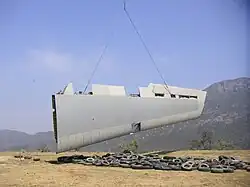 Whilst flying in the air and pondering the design, Hertz imagined a floating roof that would hang over the site to minimize structural obstructions of the views of a nearby mountain ridge. Hertz's initial concept sketches showed a site section with a curved ceiling and a roof form that reminded him of the wing section of an airplane. The wing, a self-supporting structure, cantilevers off the fuselage of an airplane like an outstretched arm. This requires little vertical support and only a few walls, which is ideal for a structure to minimize obstructions and maximize views.[3] Creating a wing foil shaped roof would be complex and difficult to build conventionally.[3] Through examining and exploring a variety of actual wing dimensions, Hertz determined that the wings from a 747 would fit on the existing pads and that they were already oriented to keep the views. The low profile of the wings was integrated into the ridge top, and the wing made to appear to cascade down and float above the ground. Utilizing the wings as 100% post-consumer recycled components and appropriating them in creative new ways is consistent with the existing context of Duquette's structures of found objects and emblematic of Hertz's thoughts on the "disposable" nature of our society.[4]