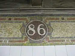 The walls along all four platforms are clad with white ceramic tiles. The ceramic tiles were installed during the early-2000s renovation and are raised about 1⁄4 inch (6.4 mm) from the original layer of tile. At the top of each wall is a colored mosaic frieze consisting mostly of yellows and browns.[5]: 4 Small "86" tablets in a circle run along this frieze.[5]: 4 [48] The name tablets have "86TH STREET" in a white serif font on a reddish-brown background with a buff-colored inner border and green outer border.[5]: 4 [49] Similar tile signs reading "DOWNTOWN TRAINS" and "UPTOWN TRAINS", accompanied by white arrows, are on the walls.[5]: 4 At the extreme southern ends of all four platforms, there are tan terracotta blocks and a darker trim line with "86TH ST" written on it in white sans serif font at regular intervals.[5]: 5