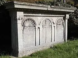 A wide stone in a combination of classical styles and Arts and Crafts decoration was erected over the tomb. To Mundella's name was added the inscription: "Loving knowledge for its own sake, he strove to diffuse it among his countrymen. He laboured for industrial peace, and the welfare of the children of the poor."