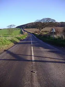 The road now rises away from the marshes and twists and turns into the next village of Kelling. The road now passes through the gentle and heaths of Kelling Heath and Weybourne. Just before entering the village of Weybourne, the road passes Weybourne Camp on the left. The road now passes through the village of Weybourne (45.5 miles (73.2 km)) and up a hill past the village Windmill.