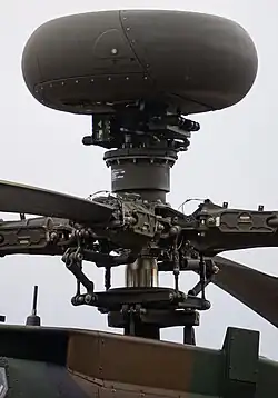 The AN/APG-78 Longbow is a millimeter-wave fire-control radar (FCR) target acquisition system and the Radar Frequency Interferometer (RFI), which are housed in a dome located above the main rotor.[4][5] The radome's raised position enables target detection while the helicopter is behind obstacles (e.g. terrain, trees or buildings). The APG-78 is capable of simultaneously tracking up to 128 targets and engaging up to 16 at once; an attack can be initiated within 30 seconds.[6][7] A radio modem integrated with the sensor suite allows data to be shared with ground units and other Apaches, allowing them to fire on targets detected by a single helicopter.[8]