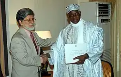 Wade subsequently spent a year in France, returning to Senegal on 27 October 1999.[17][18] In the first round of the 2000 presidential election, held on 27 February, he again took second place, receiving 31% of the vote, but for the first time, Diouf did not win a first round majority,[8] and consequently a second round was held on 19 March. Wade won this round with 58.49% of the vote,[8][19] having received the support of candidates from the first round, including third place candidate Moustapha Niasse. Wade became President on 1 April 2000 and appointed Niasse as his Prime Minister shortly afterwards.[19] Wade initially cohabited with the PS, which held a majority in the legislature until the PDS and its allies (the Sopi Coalition) won a majority in the April 2001 parliamentary election.