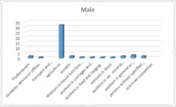 According to the 2011 census, occupations in skilled trades was the most widespread for men, while six men were variously employed as managers, directors, professionals and senior officials; occupations with lowest counts were in sales and customer service and administrative and secretarial occupations. Eight women were employed in administrative and secretarial services, with the lowest count was for professions.[4][5]
