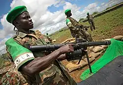 On 1 February 2007 Burundi committed to the peacekeeping mission, pledging up to 1,000 troops.[39] By 27 March, it was confirmed that 1700 Burundian peacekeepers would be sent to Somalia.[40] On 2 February 2007, the United Nations Security Council welcomed the advent of the African Union and Intergovernmental Authority on Development-led peacekeeping mission.[41] On 5 February 2007 Tanzania offered to train Somali government troops, but not to deploy peacekeepers.[42] On 9 February 2007 a gathering of 800 Somali demonstrators in north Mogadishu, where Islamist support was strongest, burned U.S., Ethiopian, and Ugandan flags in protest of the proposed peacekeeping mission. A masked representative of the resistance group, the Popular Resistance Movement in the Land of the Two Migrations, said Ethiopian troops would be attacked in their hotels; the same group had made a video warning peacekeepers to avoid coming to Somalia.[43] By this date, Uganda, Nigeria, Ghana, Malawi and Burundi had committed to the peacekeeping mission, but the total force was about half of the proposed 8,000-strong force.[44] Uganda had pledged 1,400 troops and some armored vehicles for a mission lasting up to 9 months, and the AU had pledged $11.6 million.[45] On 16 February 2007 Uganda announced it would deploy 1,500 well-seasoned troops as early as Saturday, 17 February 2007 under the command of Major General Levi Karuhanga. Reportedly the troops had been training for two years in preparation for the mission.[46]