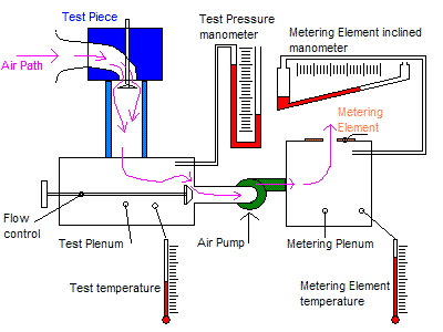Air flow conditions must be measured at two locations, across the test piece and across the metering element. The pressure difference across the test piece allows the standardization of tests from one to another. The pressure across the metering element allows calculation of the actual flow through the whole system.