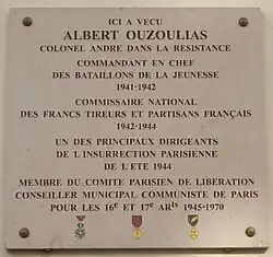 Ouzoulias was active in the youth organization of the French Communist Party before the war. He was enlisted in the army when the war broke out, was captured in 1940 and interned by the Germans, but escaped and made his way back to France in July 1941. There he took charge of fighting units organized from the Communist youth. He was assigned to various senior positions in the Communist resistance organization. He was in charge of all resistance forces in the Paris region at the time of the liberation of Paris by the Allied forces in August 1944. After this he was given responsibility for integrating the resistance fighters into the regular army. Despite his role in the Resistance, Ouzoulias did not play an important role in politics after the war, but was involved in municipal politics and veterans' organizations.