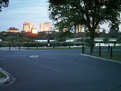 Aughtie Drive (part of the Grand Prix track) looking east over Gunn Island toward 470 St Kilda Road, St Kilda (main reflection), in the St Kilda Road residential and office precinct