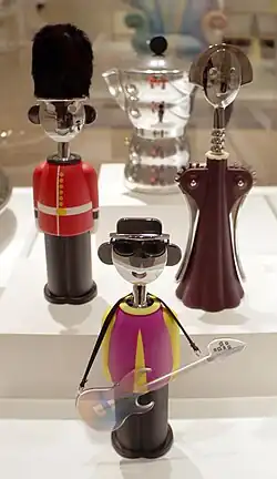 The 1980s marked a period in which Italian design factories had to compete with mass production. These movements had a different view on design, for the Italian design factories the design and therefore the designer was the most important part of the process while for the mass production the design had to be functional and easy to be reproduced.[2] Also in the 1980s, they changed their marketing image from factory to industrial research lab, a place for research and production. For Alessi the 1980s are marked with some designs like the Two tone kettle by Sapper, their first cutlery set Dry by Castiglioni. Alessi collaborated with new designers, including Aldo Rossi, Michael Graves, and Philippe Starck, who have been responsible for the some of Alessi's all-time bestsellers like the kettle with a bird whistle by Graves.