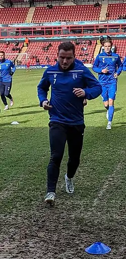 MacDonald (wearing number 7) warming up for Gillingham in 2023