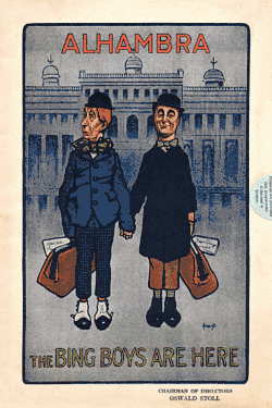 During World War I, a series of hit revues played at the Alhambra that included The Bing Boys Are Here (1916), which featured the first performances of the song If You Were The Only Girl In The World, performed by Violet Lorraine and George Robey [1]. This was followed by The Bing Boys on Broadway (1917) and The Bing Boys are There (1918). The music for the revues was written by Nat D. Ayer with lyrics by Clifford Grey, and the text was by George Grossmith Jr.[8]