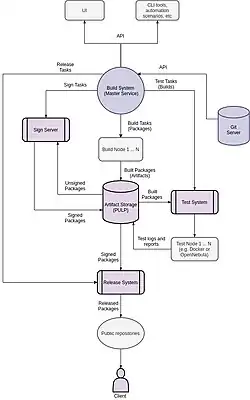 Corresponding with the Master Service, the Build Node's purpose is to perform the compilation of source code stored in the Git repositories to create RPM packages that can later be used as part of the distribution installation process. As artifacts of the build process, these pieces have a dedicated storage from which they can be further processed.