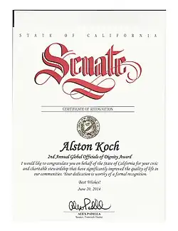 He received certificates of recognition from the California State Senate and United States Congress for improving the lives of communities in America.[13]