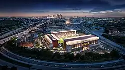Having bought the site in March 2024,[1] Detroit City FC announced on May 16, 2024, that they had purchased the land the abandoned Southwest Detroit Hospital site in Corktown, located in southwest Detroit, with intentions to build a 15,000 seat soccer-specific stadium.[2] A project estimated to cost around $150 million,[3] the development has additions to the site includes mixed-use development that includes housing, commercial space, and a parking garage.[4][5] The team named in July architects HOK to help design the stadium, with the architect firm having worked on previous soccer stadiums like Lynn Family Stadium and Energizer Park.[6]