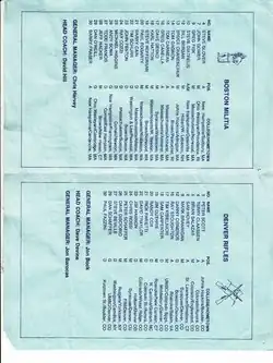 For the most part, players were assigned to teams on a regional basis to increase fan loyalty stemming from their college experiences. The Syracuse team was made up of mostly Syracuse University and Hobart College players; The Boston team made up of University of Massachusetts and Brown University players; the Baltimore team consisted of Johns Hopkins, University of North Carolina and Loyola University athletes; the Denver Rifles had players hailing from The University of Colorado, Colorado State University and Colorado College etc. Players were signed to uniform two-year contracts that paid $4,800 the first year and $6,000 in 1989. At that same time the MILL (the indoor league) was still paying its players $100 per game.[12] The first player officially signed by the league was Greg Fisk, an All-American Midfield hailing from the University of Massachusetts and signed to the Boston Militia.[13]