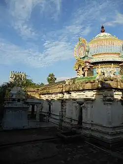 The present masonry structure was built during the Chola dynasty in the 9th century, while later expansions are attributed to Thanjavur Nayaks. The temple has a three-tiered rajagopuram (temple tower gateway) and has a moat both inside and outside its surrounding walls. There is a Saptamatrikas sculpted in a single panel and image of Tapsiviyaman. The Dakshinamurthy sculpture on the temple is unique as it is depicted with four hands - the upper right holding a bead made of Rudraksha, the upper left holding Agni (fire), the lower right holding cinmudra and lower left holding palm leaves. The temple tank associated with it is called Caturveda Tirtha, while the tree associated with the temple is Vanni. The presiding deity is Shiva in the form of Amirthakalasanathar or Amirthakadeswarar. The consort is Amirthavalli. Most of the shrines were constructed by the Medieval Cholas. There are shrines to Murugan and Ganesa. There is also a brick halls from the Thanjavur Nayak period.[2] The image of Lingothbhava is made of emerald, while the image of Ardhanarishvara is depicted with his right leg in relaxing posture. There are smaller shrines for Dhandapani Muruga in a small size and Nardana Vinayaka on the southern side. The front hall houses the Nandi Bali Peeta.[3]