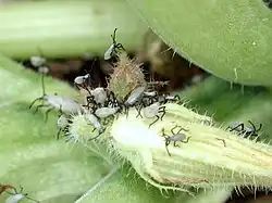 Anasa tristis can be found on various members of the gourd family Cucurbitaceae, but most often occurs on pumpkins and squashes. Some varieties and cultivars are more susceptible to attack than others. Research has shown that nymphs can grow to adulthood with varying degrees of success on different host plants; 70%, 49%, 14%, 0.3% and 0% survived to maturity on pumpkin, squash, watermelon, cucumber and cantaloupe melon respectively.[3] Nymphs can develop from the first instar to the second instar when fed on pumpkin, cucumber, or even water alone, but only pumpkin allows development to the third instar. Nymphs fed on cucumbers live longer than those who fed on water alone.[4]