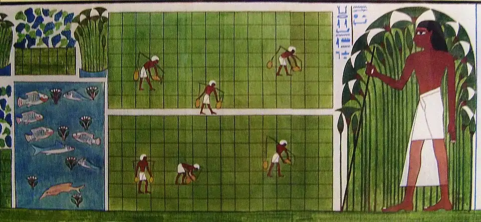 Orchards and gardens were also developed in addition to field planting in the floodplains. This horticulture generally took place further from the floodplain of the Nile, and as a result, they required much more work.[13] The perennial irrigation required by gardens forced growers to manually carry water from either a well or the Nile to water their garden crops. Additionally, while the Nile brought silt which naturally fertilized the valley, gardens had to be fertilized by pigeon manure. These gardens and orchards were generally used to grow vegetables, vines and fruit trees.[14]