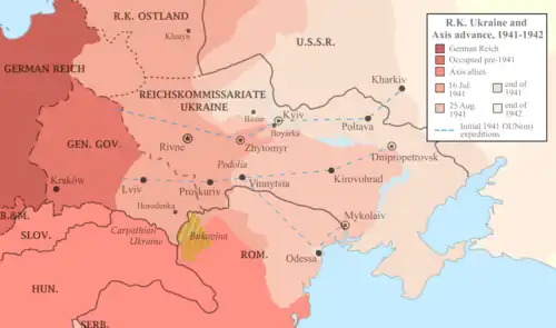 On 28 July, Melnyk sent a letter to Heinrich Himmler protesting the annexation of Galicia into the territory of the General Government.[72] The OUN-M formed the Bukovinian Battalion under the Abewehr in August which, alongside OUN-M members in the Ukrainian Auxiliary Police, would go on to be implicated in the implementation of the Holocaust— Melnyk's own reaction and proximity to this is underesearched in the scholarship.[73][74][75][76] In contrast to the OUN-B, Melnyk and his supporters meanwhile avoided making any unilateral proclamations, competing with Bandera's supporters for influence in Western Ukraine and intent on cooperating and gaining favour with the SS and the Wehrmacht in pursuit of a military-political arrangement similar to that of Tiso's Slovakia and Ustaša Croatia.[1][77][78][k]