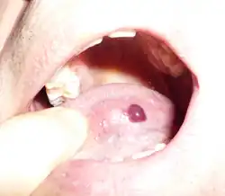 Angina bullosa haemorrhagica is a condition of the mucous membranes characterized by the sudden appearance of one or more blood blisters within the oral cavity.[1]: 808 The lesions, which may be caused by mild trauma to the mouth tissues such as hot foods, typically rupture quickly and heal without scarring or further discomfort.[2] The condition is not serious except in rare cases where a large bulla that does not rupture spontaneously may cause airway obstruction.
