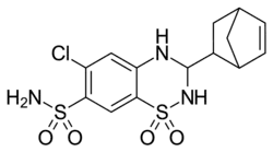 Cyclothiazide (Anhydron, Acquirel, Doburil, Fluidil, Renazide, Tensodiural, Valmiran), sometimes abbreviated CTZ, is a benzothiadiazide (thiazide) diuretic and antihypertensive that was originally introduced in the United States in 1963 by Eli Lilly and was subsequently also marketed in Europe and Japan.[1][2] Related drugs include diazoxide, hydrochlorothiazide, and chlorothiazide.[3]