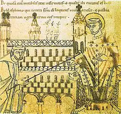 The office of archchancellor of the Imperial Kingdom of Italy was at this period regarded as an appanage of the Archbishopric of Cologne, and this was probably the reason why Anno had a considerable share in settling a papal dispute brewing since 1061: relying on an assessment by his nephew Bishop Burchard of Halberstadt, he declared Alexander II to be the rightful pope at a synod held at Mantua in May 1064, and took other steps to secure his recognition against Empress Agnes' candidate Antipope Honorius II.[1] Returning to Germany, however, he found the chief power in the hands of Archbishop Adalbert of Bremen, and as he was disliked by the young emperor, Anno gradually lost ground at the imperial court though he regained some of his former influence when Adalbert fell from power in 1066. In the same year he was able to secure the succession of his nephew, Conrad of Pfullingen, as Archbishop of Trier. By 1072 he had become imperial administrator and thus the second most powerful man,[5] acting as an arbitrator in the rising Saxon Rebellion.
