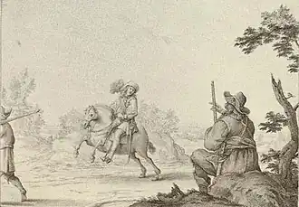 About three quarters of his drawings are landscapes, often set in winter and mainly depicting hilly areas at the edge of a wood. The landscapes are always populated with a few figures such as hunters, horsemen, soldiers, peasants, fishermen or beggars. Some drawings include a castle or monastery in the vicinity of Brussels.[2] An example is the Hunters resting on the board of a river in front of Tervuren castle near Brussels (at Christie's 16 October 2013, Paris, lot 167).[3]