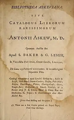 - ^ According to Seymour de Ricci, Askew purchased Maffei family classical codices, Greek manuscripts from R. Mead and Dr. Taylor's papers in an attempt to purchase all of the published Greek classics.[7]