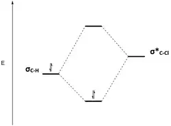 An important factor in the antiperiplanar conformer is the interaction between molecular orbitals. Anti-periplanar geometry will put a bonding orbital and an anti-bonding orbital approximately parallel to each other, or syn-periplanar. Figure 6 is another representation of 2-chloro-2,3-dimethylbutane (Figure 5), showing the C–H bonding orbital, σC–H, and the C–Cl anti-bonding orbital, σ*C–Cl, syn-periplanar. The parallel orbitals can overlap and become involved in hyperconjugation. If the bonding orbital is an electron donor and the anti-bonding orbital is an electron acceptor, then the bonding orbital will be able to donate electronegativity into the anti-bonding orbital. This filled-to-unfilled donor-acceptor interaction has an overall stabilizing effect on the molecule. However, donation from a bonding orbital into an anti-bonding orbital will also result in the weakening of both of those bonds. In Figure 6, 2-chloro-2,3-dimethylbutane is stabilized through hyperconjugation from electron donation from σC-H into σ*C-Cl, but both C–H and C–Cl bonds are weakened. A molecular orbital diagram shows that the mixing of σC–H and σ*C–Cl in 2-chloro-2,3-dimethylbutane lowers the energy of both the orbitals (Figure 7).