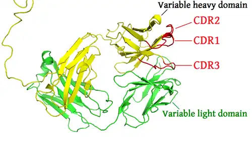 The complementarity determining regions of the heavy chain are shown in red (PDB: 1IGT​)