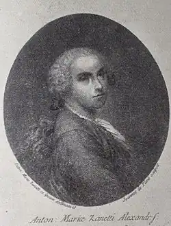 Antonio Maria was born in the parish of San Giacomo dell'Orio in Venice on 1 January 1706. He was the elder of two sons. The family of his father, Alessandro Zanetti, belonged to the citizen class, whereas the family of his mother, Antonia Limonti, originated in Milan.[1] At an unknown later date, the family transferred to the parish of Santa Maria Mater Domini.[2] As a youth, Antonio Maria studied with the Jesuits. He had a particular aptitude for the classics and over time, became proficient in Greek.[1][3] He also learned to paint under the guidance of Nicolò Bambini.[2] Most importantly, he became a protégé of his homonymous older cousin Antonio Maria Zanetti and developed into a distinguished scholar of the antiquities and an art connoisseur.