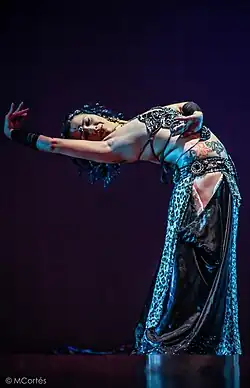The term "Arabic dance" is often associated with belly dancing.[3] However, there are many styles of traditional Arab dance[4] and many of them have a long history.[5] These may be folk dances, or dances that were once performed as rituals or as entertainment spectacle, and some may have been performed in the imperial court.[6] Coalescence of oral storytelling, poetry recital, and music has a long-standing tradition in Arab history.[7] Among the best-known of the Arab traditional dances are the belly dance, the ardah, and the dabke.[8]