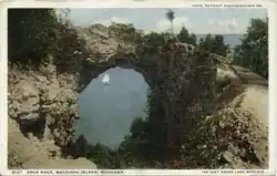 Arch Rock is a geological formation on Mackinac Island in Michigan. It is a natural limestone arch formed during the Nipissing post-glacial period, a period of high Lake Huron levels following the end of the Wisconsin glaciation. To this day Arch Rock stands on the Lake Huron shoreline 146 feet (45 m) above the water.