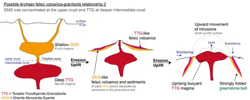 Two plutonic, igneous rock suites form 50% of Archean cratons.[6] They are (1) Tonalite-trondhjemite-granodiorite (TTG) suites and (2) Granite-Monzonite-Syenite (GMS) suites in chronological order.[6] They are magma chambers that later formed the volcanics on the Earth's surface by volcanic eruption.[30] Later they intruded the supracrustal rocks of similar age and composition in the Archean.[19] The uprising magma bodies deformed the surface greenstone belt on a cratonic scale.[5]