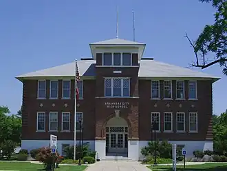 The district consolidation was the result of the Arkansas General Assembly enacting a law requiring school districts with fewer than 350 students apiece to consolidate with other districts.[5][6][7] Following the consolidation, the McGehee district continued to operate the newer Arkansas City campus as a K-6 elementary school[8] through its closure in October 2005.[9] The 1983 campus has since housed a branch of the Southeast Arkansas Regional Library System.
