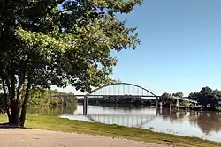 Upon entering Prairie County, Highway 38 continues to pass through rural, agricultural areas with small settlements at intersections with other state highways. The highway intersects Highway 13 at Hickory Plains, Highway 86 at Hayley, and Highway 11 at Fourmile Corner. Highway 11 begins a concurrency with Highway 38 eastward toward Des Arc, the county seat for the northern district of Prairie County.[a 1] Entering Des Arc, Highway 38 and Highway 11 intersect Highway 323 near the Lower White River Museum State Park. Highway 323 runs to the downtown business district, with Highway 38 turning northeast and bypassing most of the city. In northern Des Arc, the concurrency with Highway 11 ends, with Highway 11 turning due north toward the Bayou De View Wildlife Management Area and Searcy. This intersection also contains Highway 323Y, which is a short spur route providing access to downtown Des Arc. Highway 38 continues along the northern edge of Des Arc, passing the historic Oak Grove Cemetery, listed on the NRHP, and crossing over the White River on a 1970 steel through truss bridge. Highway 33 overlaps Highway 38 in eastern Prairie County until the Woodruff County line, when Highway 33 turns north toward Augusta, ending the concurrency.[a 2][9]