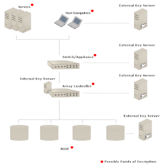 The encryption of data can take place in many points in a storage network. The point of encryption may occur on the host computer, in the SAN infrastructure, the array controller or on each of the hard disks as shown on the diagram above. Each point of encryption has different merits and costs. Within the diagram, the key server components are also shown for each configuration of encryption. Designers of SANs and SAN components must take into consideration factors such as performance, deployment complexity, key server interoperability, strength of security, and cost when choosing where to implement encryption. But since the array controller is a natural central point of all data therefore encryption at this level is inherent and also reduces deployment complexity.