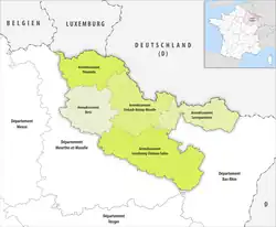 - Arrondissement of Thionville, (subprefecture: Thionville) with 104 communes. The population of the arrondissement was 273,063 in 2021.