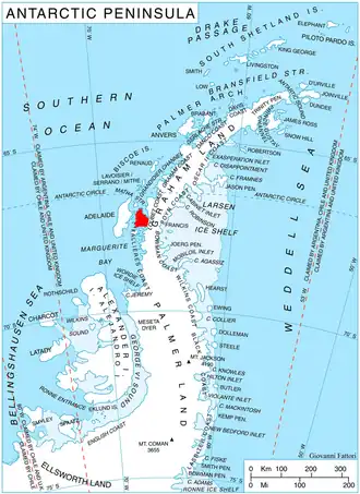 Arrowsmith Peninsula (67°15′S 67°15′W / 67.250°S 67.250°W / -67.250; -67.250) is a cape about 40 miles (64 km) long on the west coast of Graham Land, west of Forel Glacier, Sharp Glacier and Lallemand Fjord, and northwest of Bourgeois Fjord, with Hanusse Bay lying to the northwest. It was surveyed by the Falkland Islands Dependencies Survey (FIDS) in 1955-58 and named for Edwin Porter Arrowsmith, Governor of the Falkland Islands.[1]
