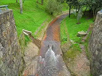 The Juan Amarillo, Arzobispo, or Salitre River,[1] is formed by various quebradas ("creeks") sourced at an altitude of 3,300 metres (10,800 ft) in the Eastern Hills of Bogotá. Main feeder creeks are Las Delicias, La Vieja, El Chicó, Los Molinos, Santa Bárbara, Delicias del Carmen, El Cóndor, El Cedro, San Cristóbal, La Cita and La Floresta.[2][3][4] The Juan Amarillo Basin covers the localities Usaquén, Chapinero and Santa Fe in its upper course and Suba, Barrios Unidos, Teusaquillo and Engativá in its lower drainage area. The Suba Hills (cerros de Suba) are located in the Juan Amarillo River basin. The total surface area of the Juan Amarillo basin is 12,892 hectares (31,860 acres).[5]