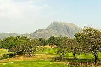 Aso Rock is a large outcrop of granitic rock located on the outskirts of Abuja, the capital of Nigeria. The Aso Rock is a 400-metre (1,300 ft) prominent monolith with a peak height of 936-metre (3,071 ft) above sea level.[1][2] It is one of the city's most noticeable features. The Nigerian Presidential Complex, Nigerian National Assembly, and Nigerian Supreme Court are located around it. Much of the city extends to the south of the rock. "Aso" means victorious in the native language of the Asokoro ("the people of victory") ethnic group.