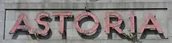 Edward Stone was regarded as "a specialist theatre and cinema architect".[43] He designed the Astoria in a French Art Deco style—similar to, but a "larger and more elaborate example" of, his Grade II-listed Whitehall Theatre[note 2] in London.[27] The walls were of brick with faience decoration and a façade of pale stone blocks, hiding a steel frame and topped by a flat roof.[27] The "handsome" façade was 45 metres (148 ft) wide and was simply detailed, "avoiding gratuitous decoration" and instead "[relying] mainly on proportion to achieve a sense of spacious grandeur".[1] It was in two parts: to the left (south), a slightly recessed ten-bay section with a strong horizontal emphasis, consisting of shop units (latterly boarded up) at ground-floor level, a tea-room above and offices on the top floor. Straight-headed casement windows with metal grilles lit this section. To the right (north) was the projecting entrance section which in contrast has a vertical emphasis: above the entrance canopy and modern double entrance door, three tall straight-headed windows at first-floor level were joined to tall arched windows above by fluted pilasters.[27][42] The second-floor windows were set into moulded recesses with keystones. Above these, a slightly recessed panel bore the name astoria in projecting letters.[27]